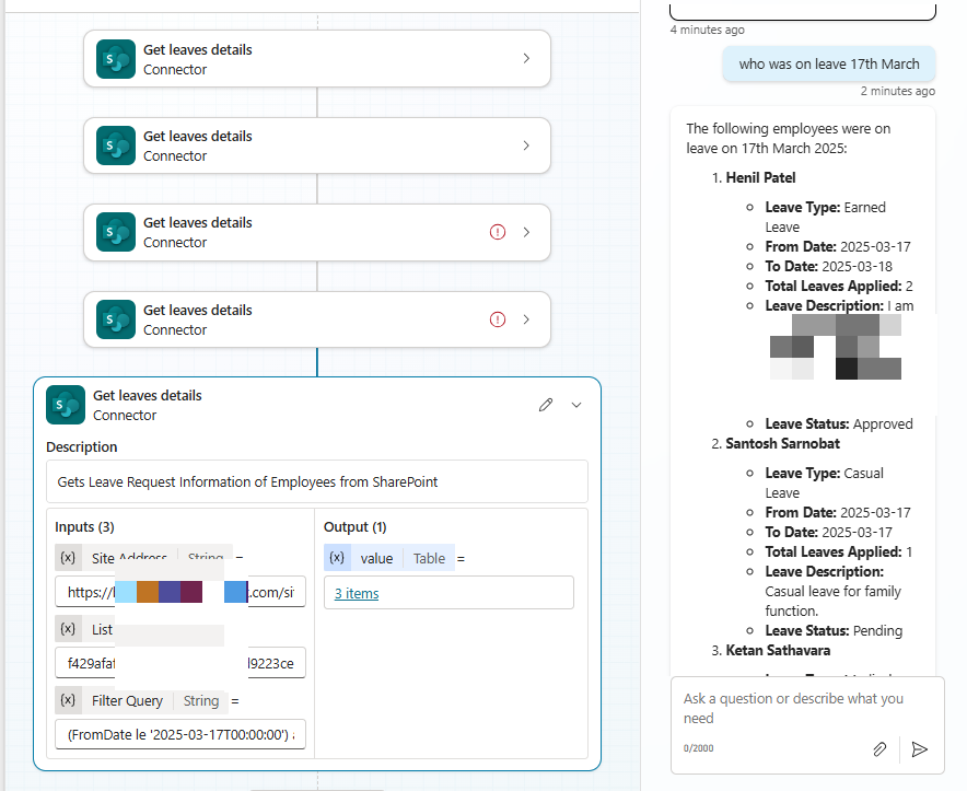 Reason – In my case there are more than 100 items in list so the AI is not able process the result sets. Though I am saying my leave requests, it did not respect the filter. Reason is that in Get leave details we are not passing any filters or have handled any filter conditions.