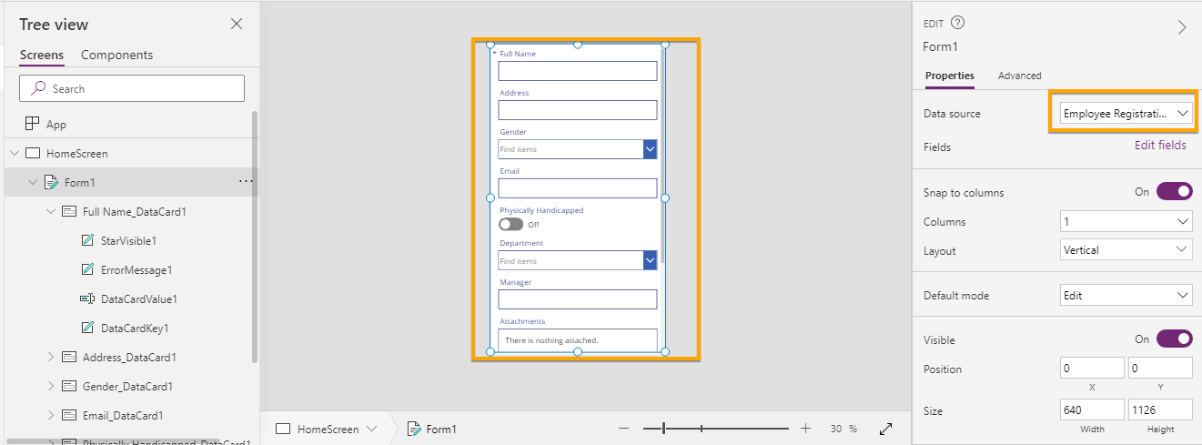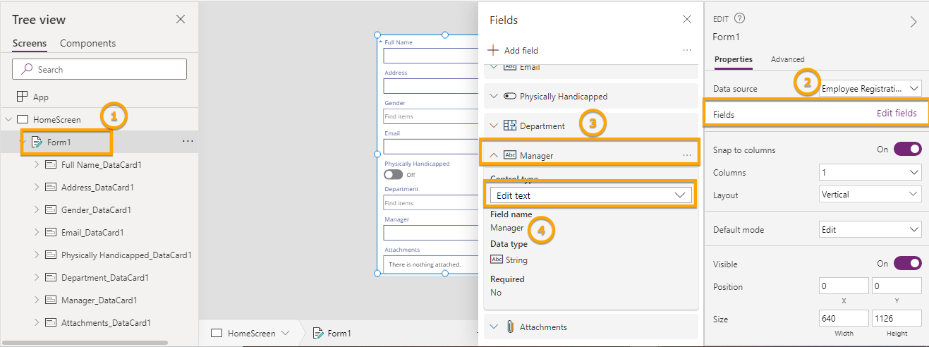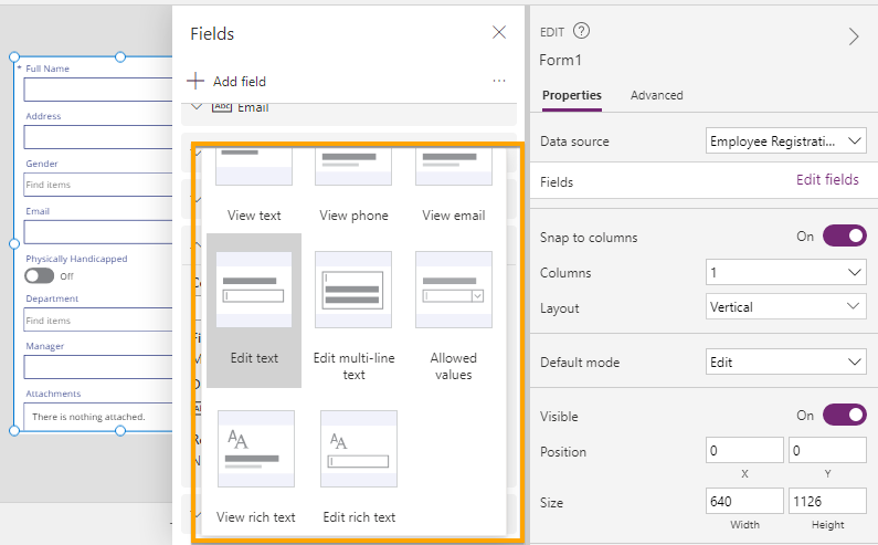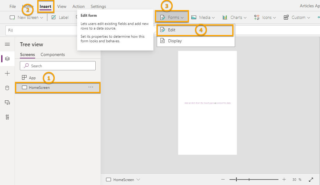 Step – Open you App > Add New Screen > from Insert Menu add Edit Forms