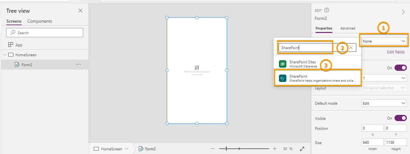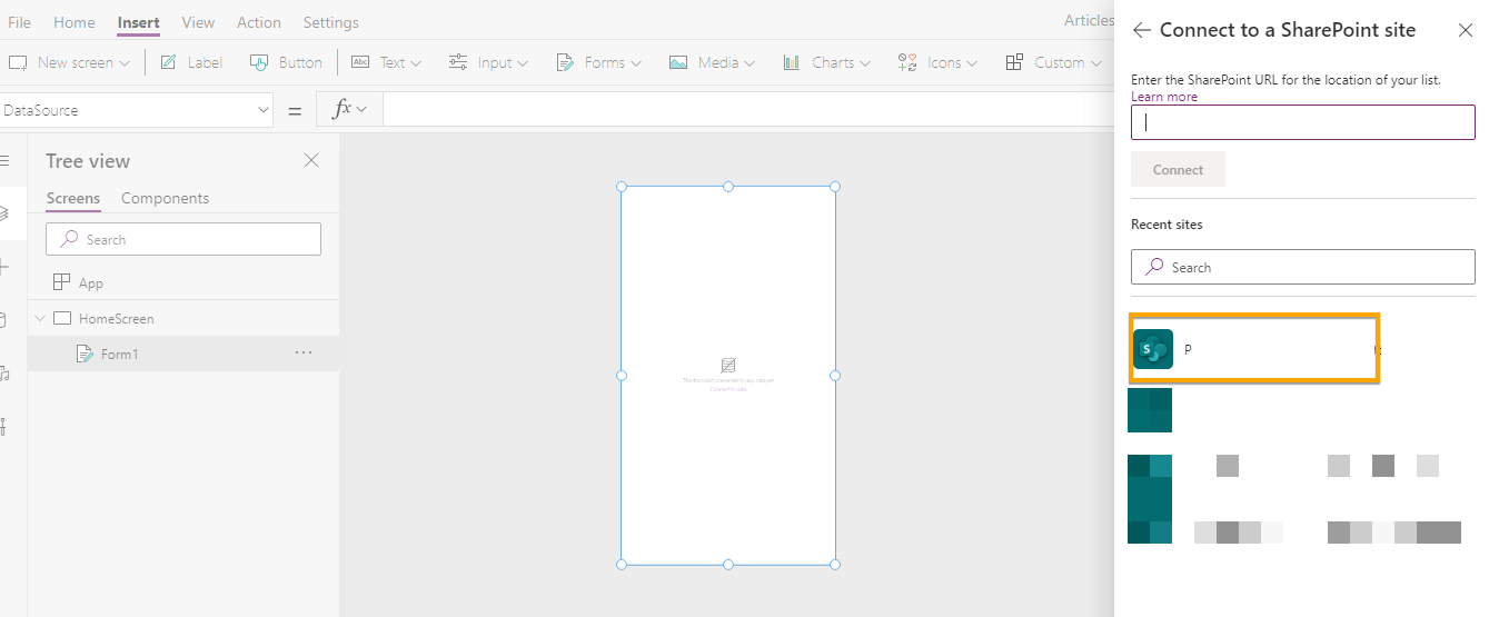 Step – On Right Pane > Select Data Source by default it will be none > from Dropdown you can search for SharePoint connector if you want to connect to SharePoint list