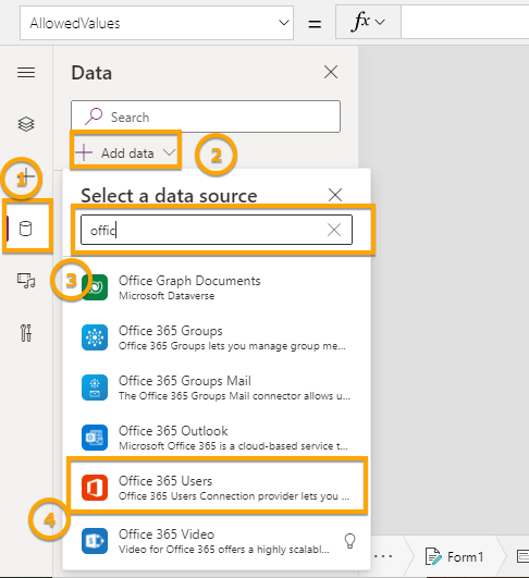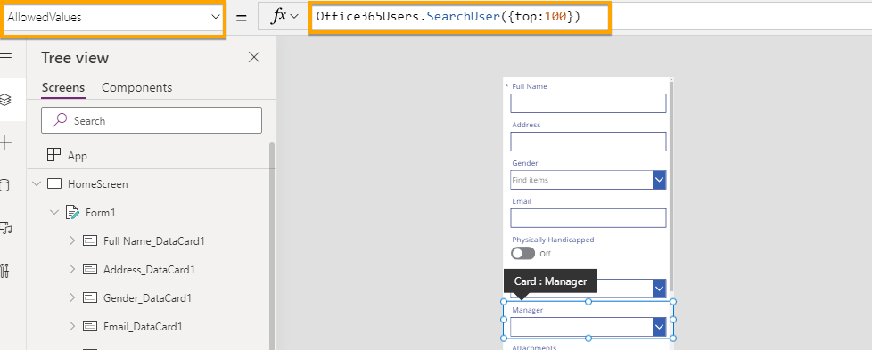 Step – Add Office365Users.SearchUser({top:100}) code in AllowedValues