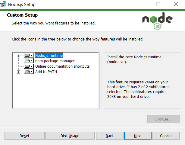 - Next screen select destination path ‘c:\Program files\nodejs’, you can choose to install on another path also.