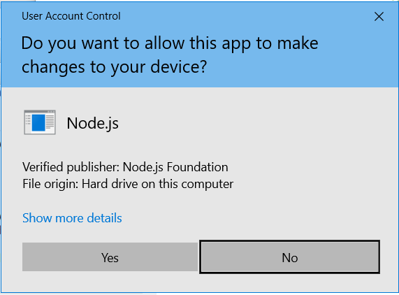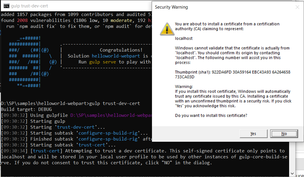 Now let’s run ‘gulp trust-dev-cert’, you will be asked to install a certificate. Click yes