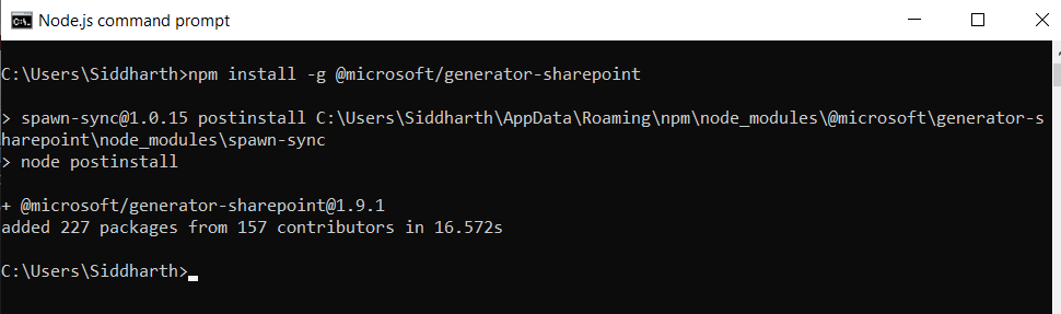 - Next, we will install the SharePoint Yoeman generator which will help in creating the SPFx solution project structure.