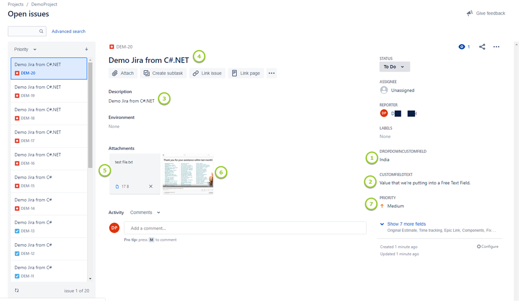 Let us go to Jira and see a newly created issue. If you see all the fields which are marked with numbers are the fields which we populated from our code.