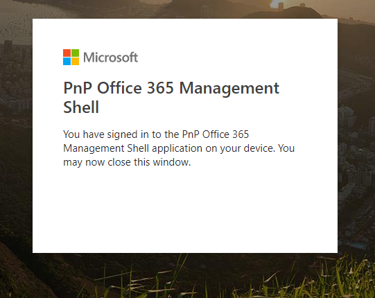 Close the browser and go back to the node.js command prompt. With this, you have successfully logged in to Office 365 and authenticated your PnP CLI to run commands on your tenant.