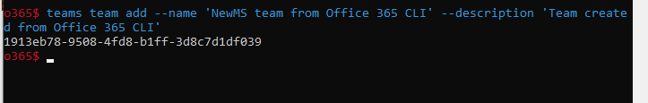 teams team add --name 'NewMS team from Office 365 CLI' --description 'Team created from Office 365 CLI'