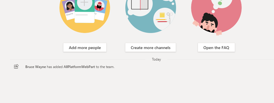 Next, let us do something fancy, we will add an SPFx web part (also marked as Teams tab in webpart.manifest.json). To know details about this you can refer to this article. I already have this SPFx app installed in app catalog which contains this ‘AllPlatformWebPart’.