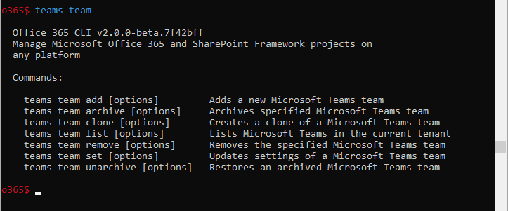 Office 365 CLI is available as an npm package and can be installed through node js command prompt. As for this article, we would be using the beta release to test Microsoft teams command. Run the below command on node js command prompt to install the next beta release (I choose this to check new features, you can install stable release if you are using it for production use).
