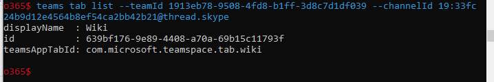teams tab list --teamId 11912ec78-9508-4fd8-b1ff-3d82731df039 --channelId 19:[email protected]