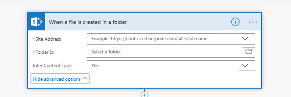 This would be a very commonly-used trigger point, it would trigger when an item is created in the library. As mentioned, it will only return properties (columns) and their values. To get file content we need to use another step. We can also select a particular folder within the library and workflow will only trigger if the item is added to that particular folder.